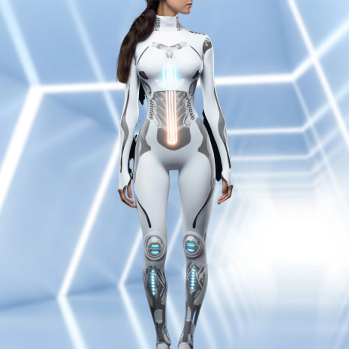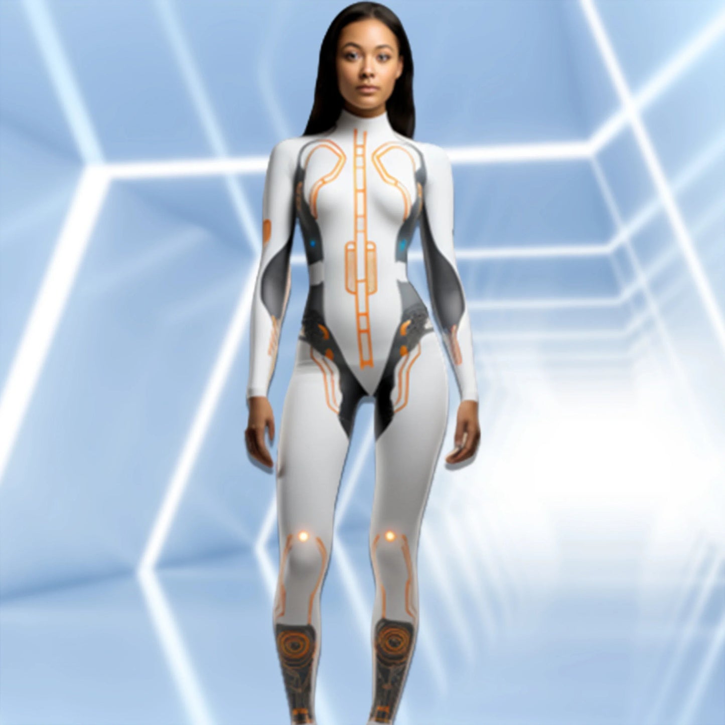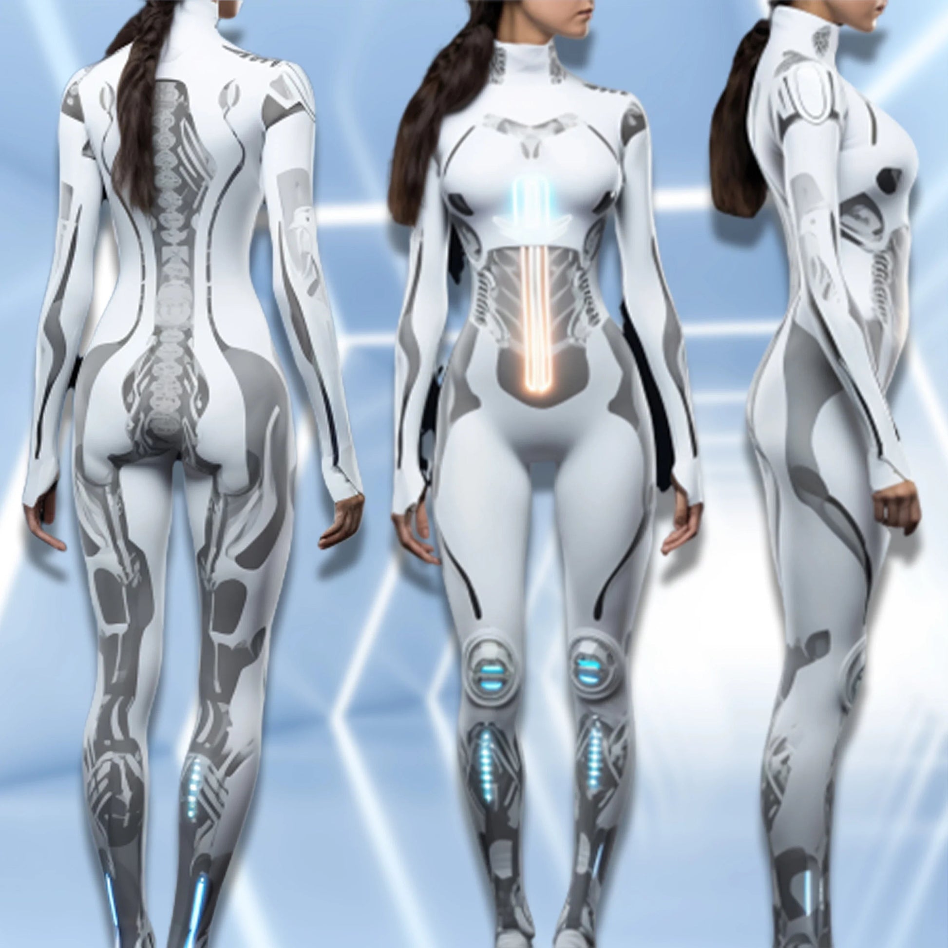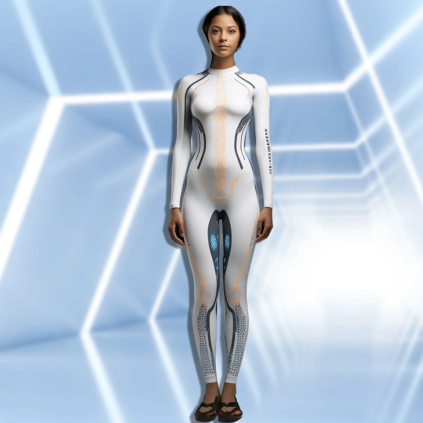 Mechanical Robot Print Cosplay Costume Women Sexy Onesie Futuristic Slim Jumpsuit Halloween Elastic Bodysuit Front Zipper Romper