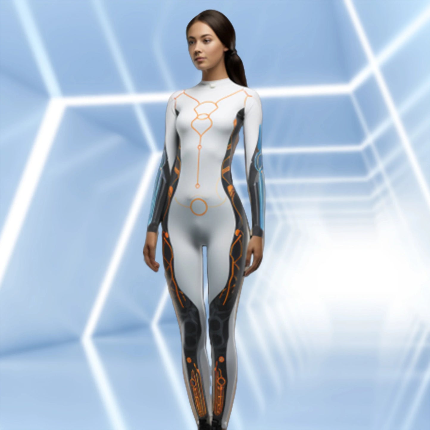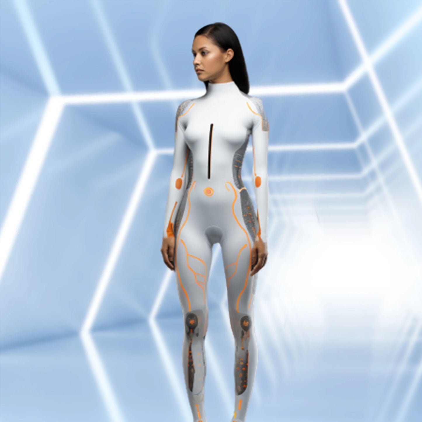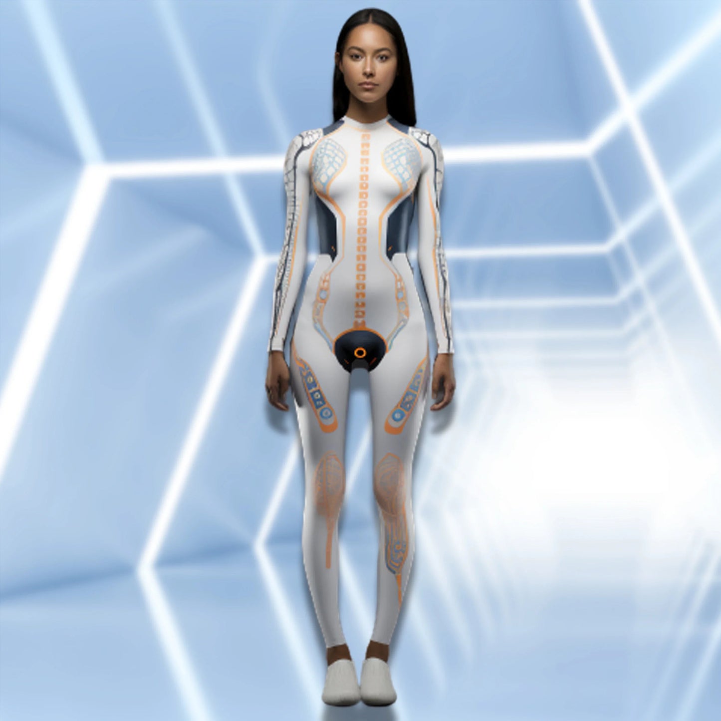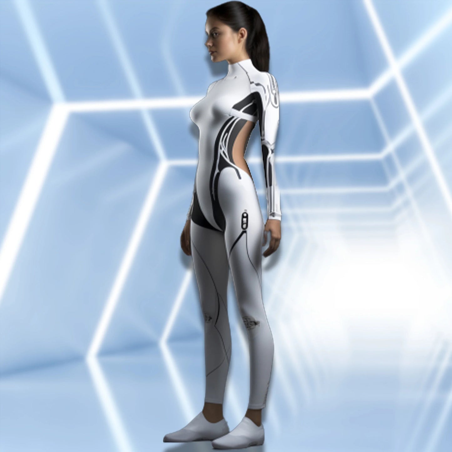 Mechanical Robot Print Cosplay Costume Women Sexy Onesie Futuristic Slim Jumpsuit Halloween Elastic Bodysuit Front Zipper Romper