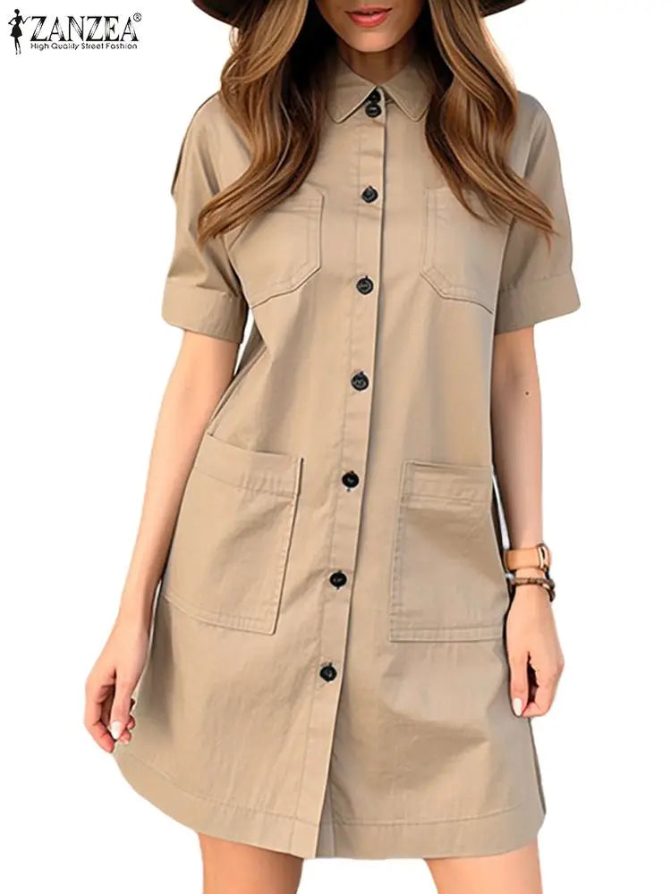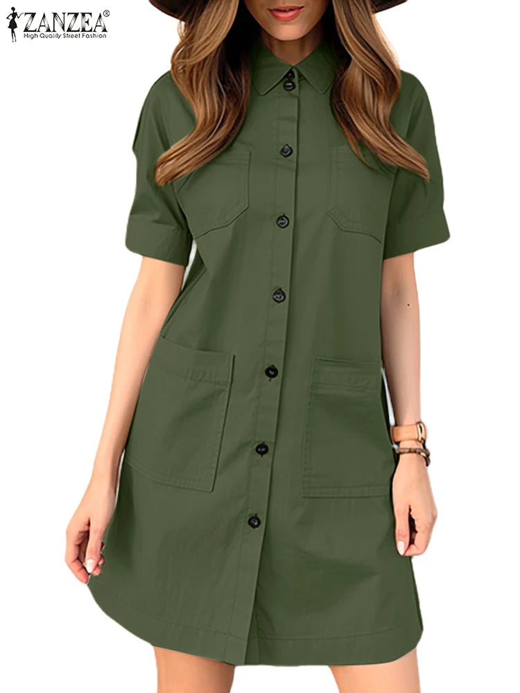 ZANZEA Elegant Women Knee-length Dress Short Sleeve 2024 Summer Button Up Work Vestido Fashion Turn-Down Collar Cargo Shirtdress